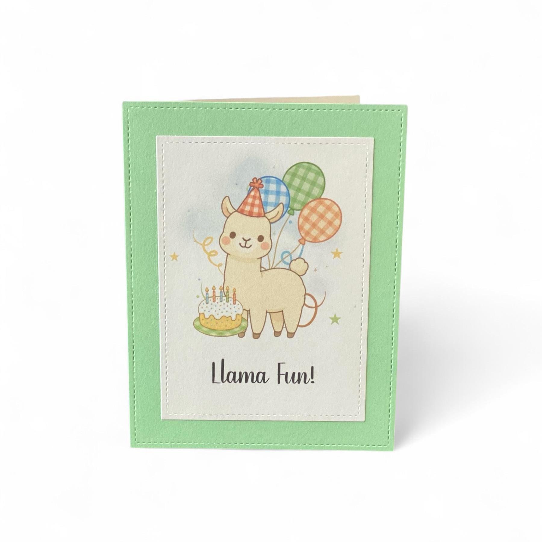Send birthday wishes with a laugh using this adorable handmade llama card! Featuring a sweet llama in a party hat with balloons and cake, and the phrase “Llama Fun!”, this card is perfect for animal lovers or fun-loving kids and adults alike. Designed on premium cardstock with stitched detailing for a professional finish.