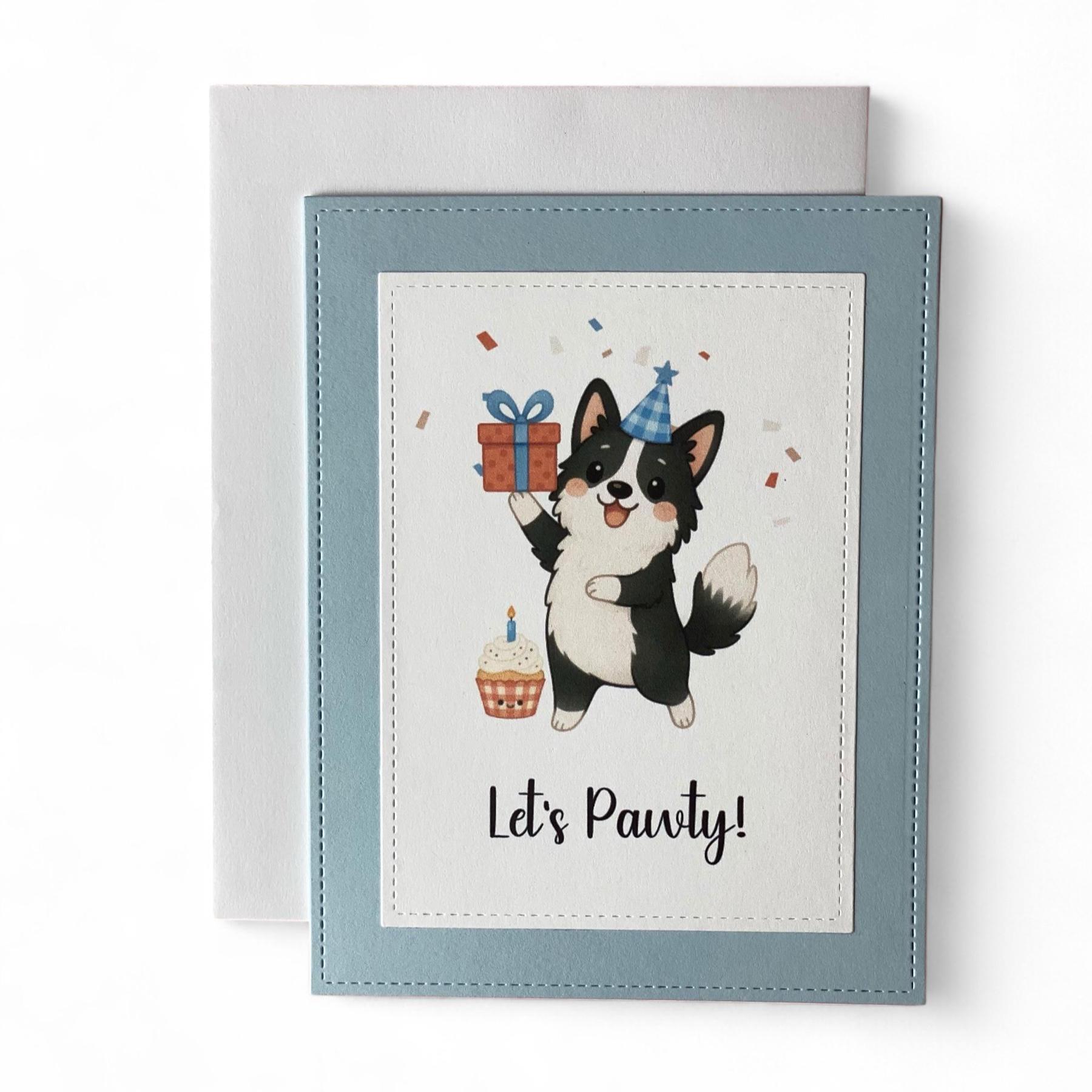 Get the pawty started with this adorable handmade birthday card! Featuring a festive pup in a party hat holding a gift and cupcake, this card is perfect for dog lovers or any fun celebration. The cheerful "Letβs Pawty!" greeting adds a playful touch.