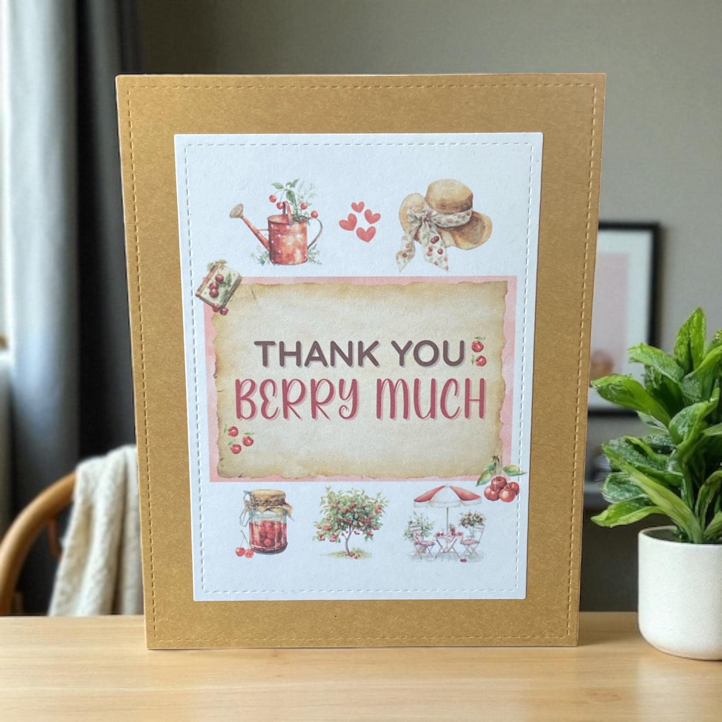Say thanks in the sweetest way with this handmade “Thank You Berry Much” card. Adorned with charming cherry and berry-themed illustrations, rustic garden details, and a playful pun, this card adds warmth and whimsy to your gratitude.
