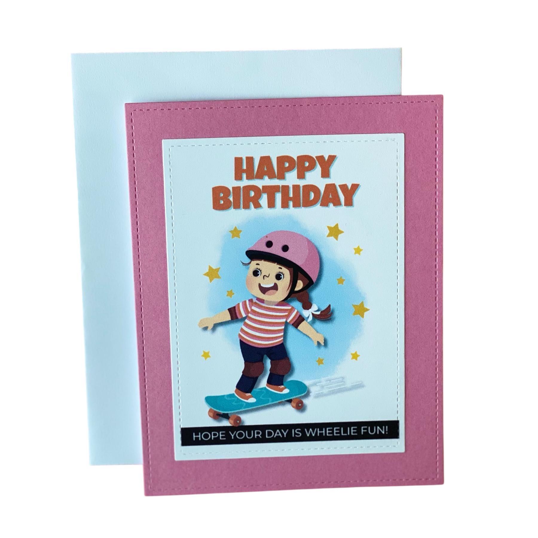 Celebrate a special kiddo's birthday with this vibrant and playful handmade card featuring a skateboarding girl in a striped tee and pink helmet. The cheerful message “Hope Your Day is Wheelie Fun!” brings a smile, making this card perfect for little adventurers and sporty girls.