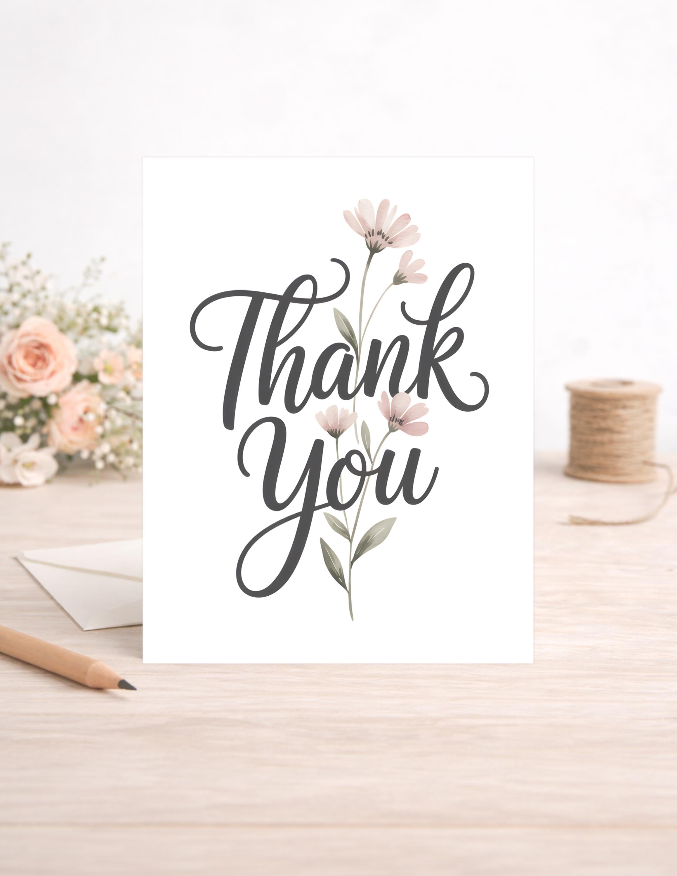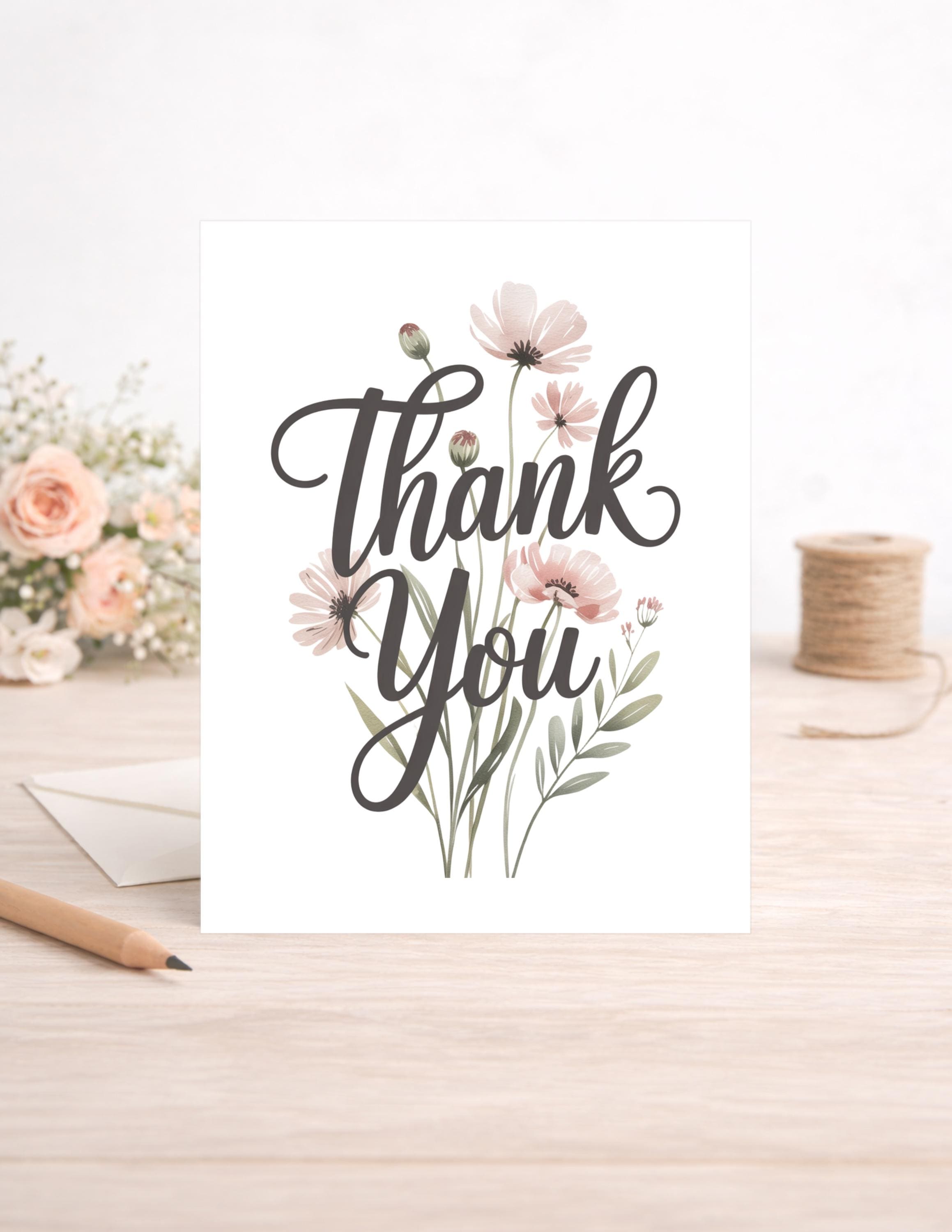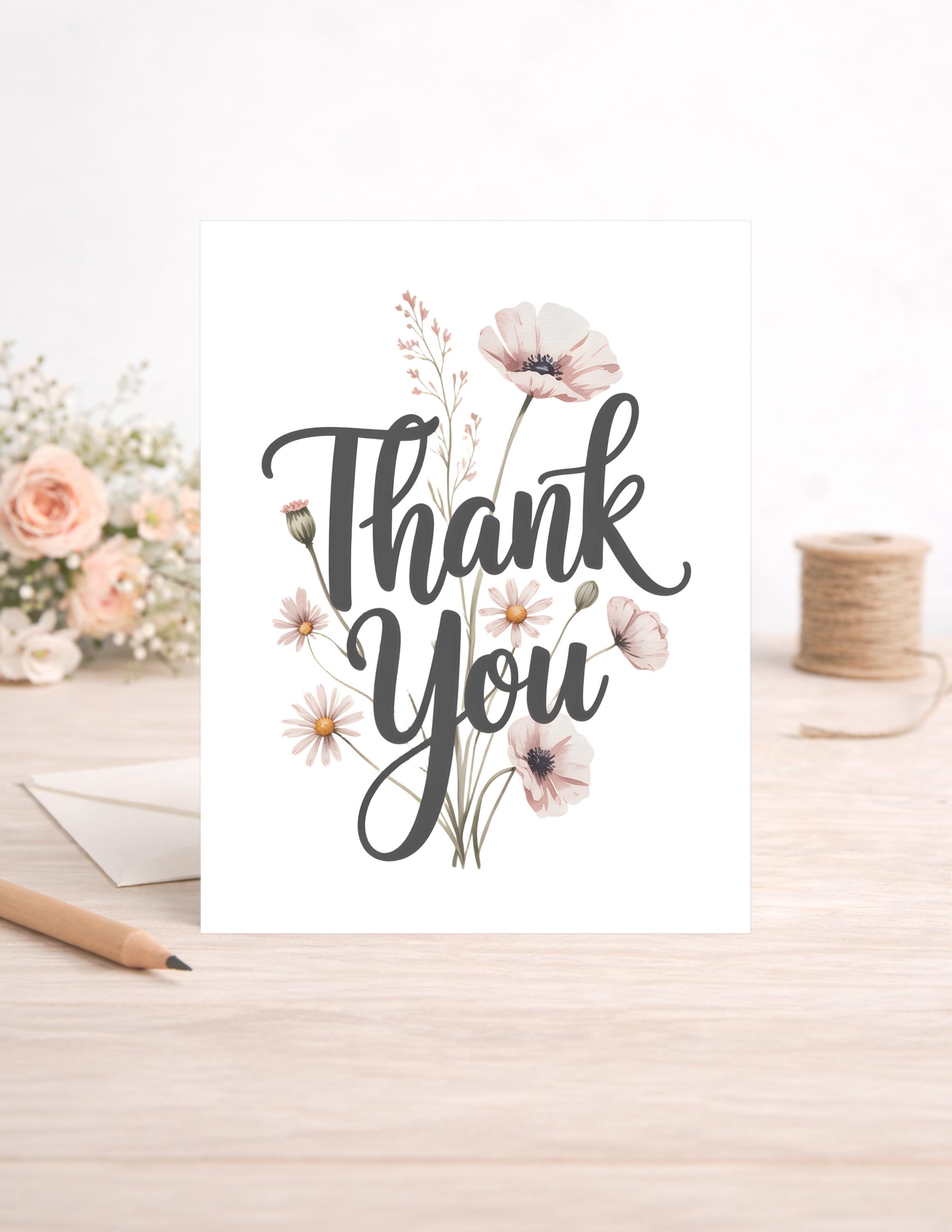 This curated set of 8 Wildflower Thank You Cards features delicate floral illustrations paired with elegant calligraphy, printed professionally on smooth 110 lb cardstock using a Canon Pixma Pro 200S for gallery-level print quality.