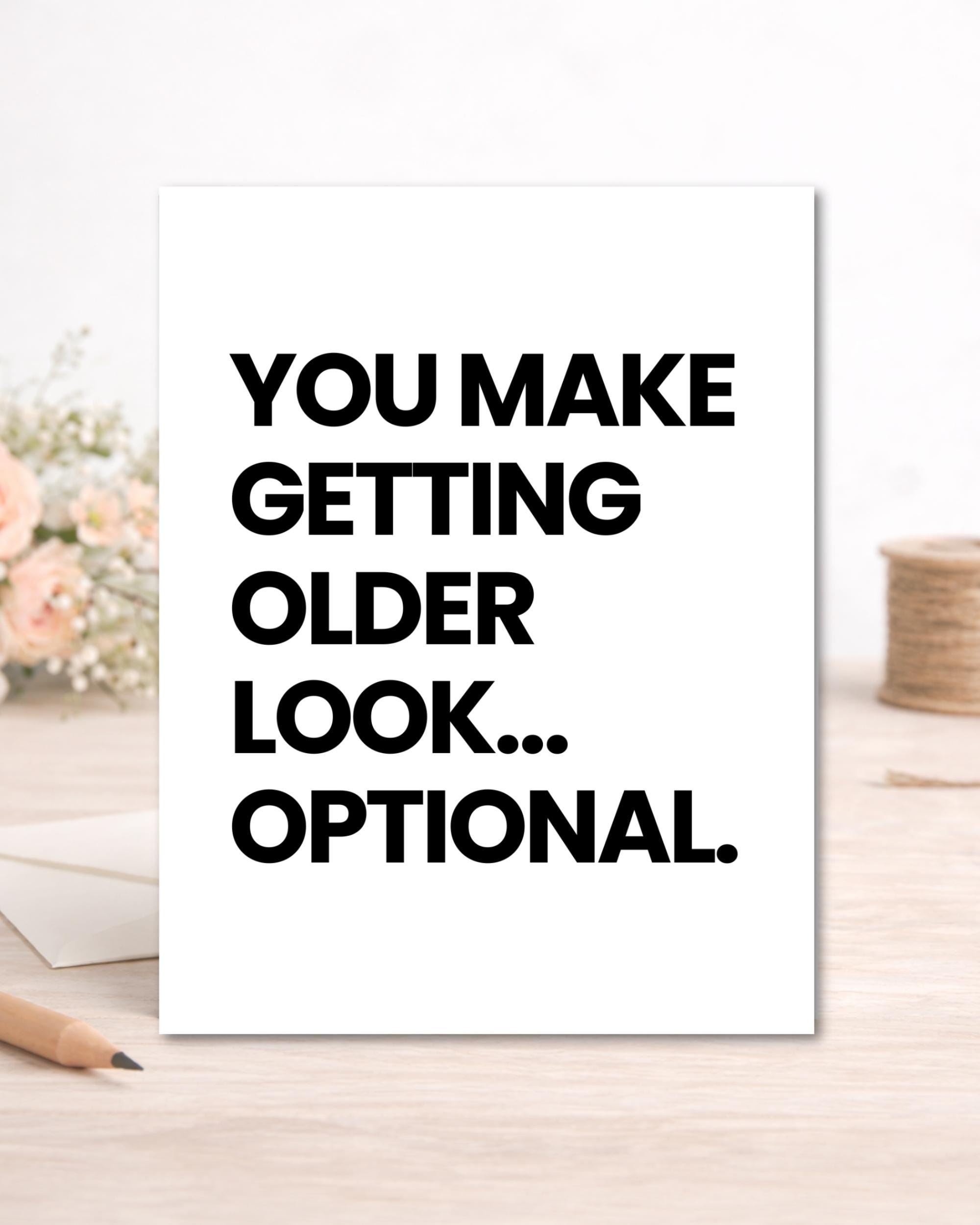 You make getting older look… optional. This funny birthday card delivers humor with clean style. Whether it’s for your best friend, your favorite coworker, or someone who’s aging too well — this minimalist design is a go-to for those who love sarcasm with a smile.