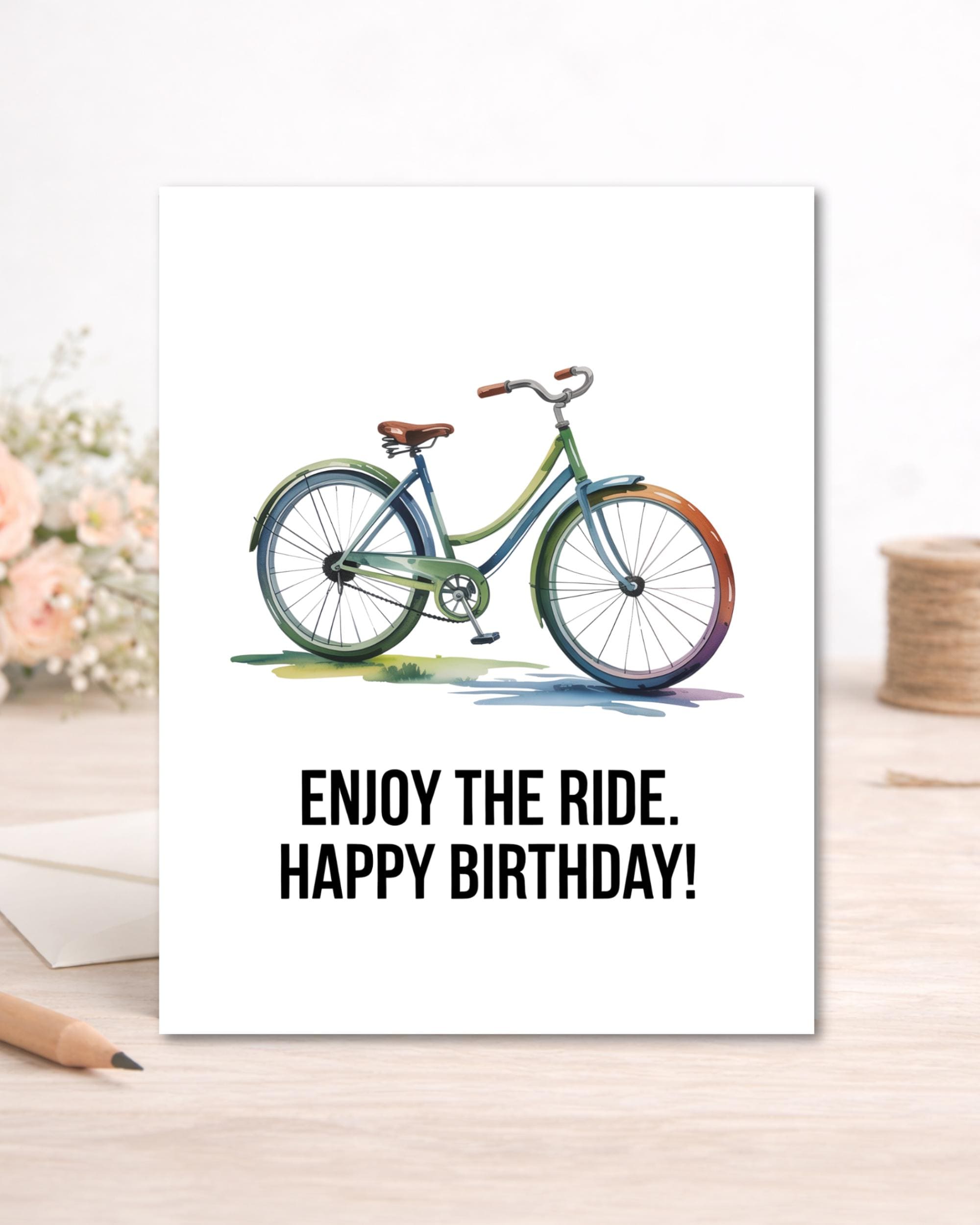 This modern birthday card features a charming illustrated bicycle paired with the message “Enjoy the Ride. Happy Birthday!” — a thoughtful reminder to embrace every year ahead. Perfect for cyclists, adventure lovers, or anyone who appreciates clean, minimalist design.